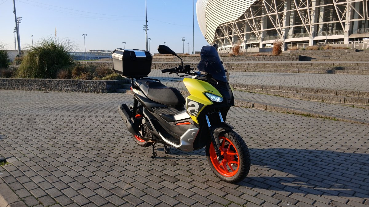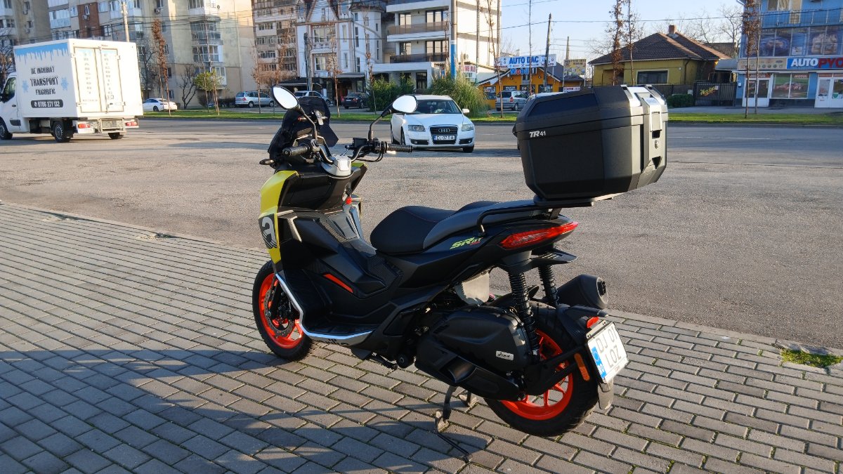 Salut! O actualizare dupa aproape un an. Dupa cum stim de progranul rabla s-a ales praful in iunie asa m-am simtit nevoit sa aleg ceva SH. Eram decis 99% si pe noul Nmax 125 plus ca intrasera ceva oferte care se invarteau in jurul sumei de 3750E. Am ales in cele din urma o Aprilia SR GT 200 2024 impecabila cumparata SH din Constanta cu doar 400km la fix suna de 3000E. Cateva impresii dupa aproximativ 4000Km: Motorul este surpriza placuta, liniar si puternic, atinge usor 100km/h dar cel mai bine se simte pe la 80-90Km/h. Maxim duce 115-120Km/h. Ma ajuta manevrabilitatea si ciclistica care este extraordinara, te cam imbie oarecum sa mergi tare. Pornirea din pacate se face clasic cu cheia in contact. Consumul dupa 4000km este de 2.6l/100km. Frane sunt foarte bune, ajuta si anvelope care au o aderenta buna. Amortizoarele pe fata sunt ok insa pe spate sunt ceva cam tari in opinia mea. Pozitia in sa este cam inalta insa la 181cm ating asfaltul cu toata talpa. Pentru persoane sub 170cm s-ar putea sa aibe ceva probleme. Odata ce te pui in miscare pozitia este perfecta pentru mine, ca pe motocicleta adv. Spatiul de sub sa este MIC, undeva la 25L, incape la limita o casca open face si ceva echipamente in caz de ploaie sau pana.. Am compensat totusi si cu un topcase. Si nu in ultimul rand imi place cum arata (cu excepria culorii jantelor). Probabil o sa le vopsesc negru la urmatorul schimb de anvelope.