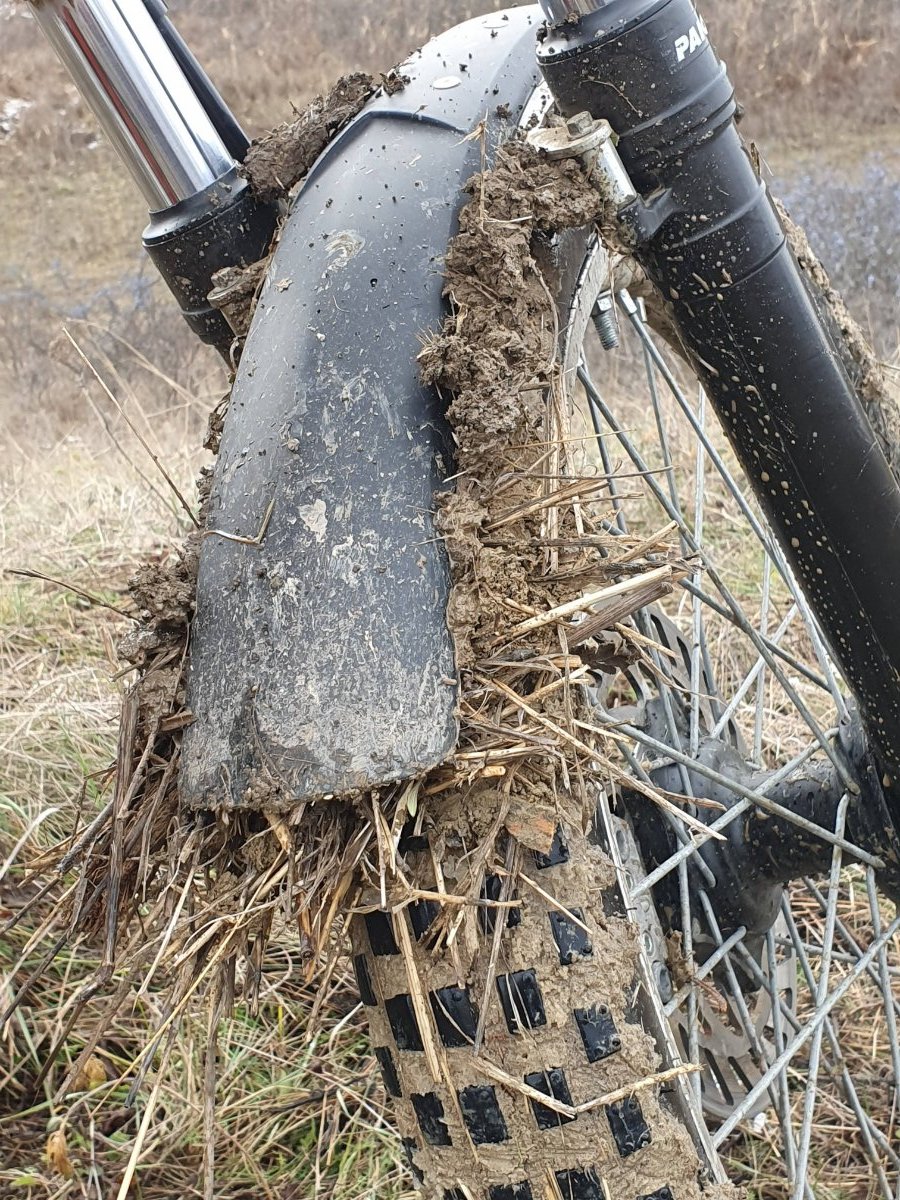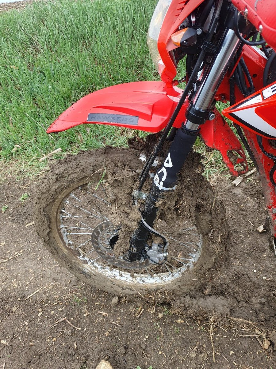 La toate modelele de trial aripa fata este jos, dar este foarte ingusta nu trebuie sa ti faci griji daca se incarca cu noroi, nu se infunda noroiul il arunca in lateral.