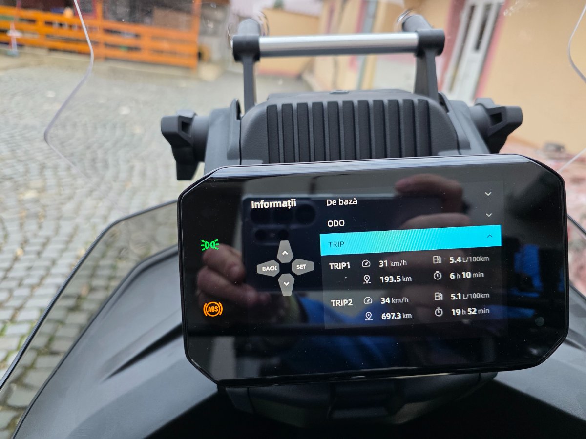 Gata si prima mie de km. Urmeaza programarea la prima revizie. Km facuti in mare parte la plimbare pe DJ-uri, mers relaxat. De bine: -consumul este undeva pe la 5,1L/100 -pozitia de pilotaj este neutra si comoda -suspensia este ok pentu drumurile mixte de Romania -electronica si aplicatia functioneaza foarte bine Asa si asa: -amorteste fundul dupa 1h de mers (saua este cam subtire). Probabil din dorinta de a avea o sa joasa, e proiectata cam subtire -nu poti merge la ralanti in tr.1 (merge foarte smucit) -cutia este scurta si in oras cam mesteci in ea De rau: -intre 3500 si 4000 rot/min bordul are o vibratie exasperanta (accentuata cand e cald afara) -dupa ce a stat 2 saptamani cu ceva sare de pe drum pe ea, o piulita de la reglajul schimbatorului a ruginit -parbrizul este ciudat de departe fata de pilot. Din aceasta cauza protectia la vant este ok (nu simti curentul de aer), dar se aude tare, tare cum se formeaza turbioanele pe langa casca. -pretul unei revizii (ulei + filtru + verificari) este 700 lei (!!!) P.S. Sunt ceva probeleme la forum. Rog un moderator sa stearga postarea precedenta.