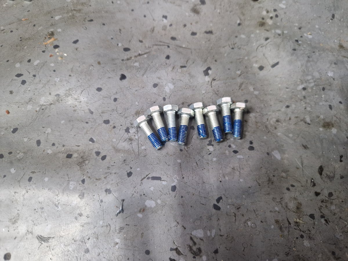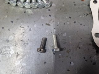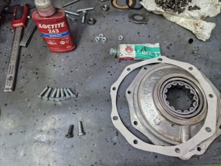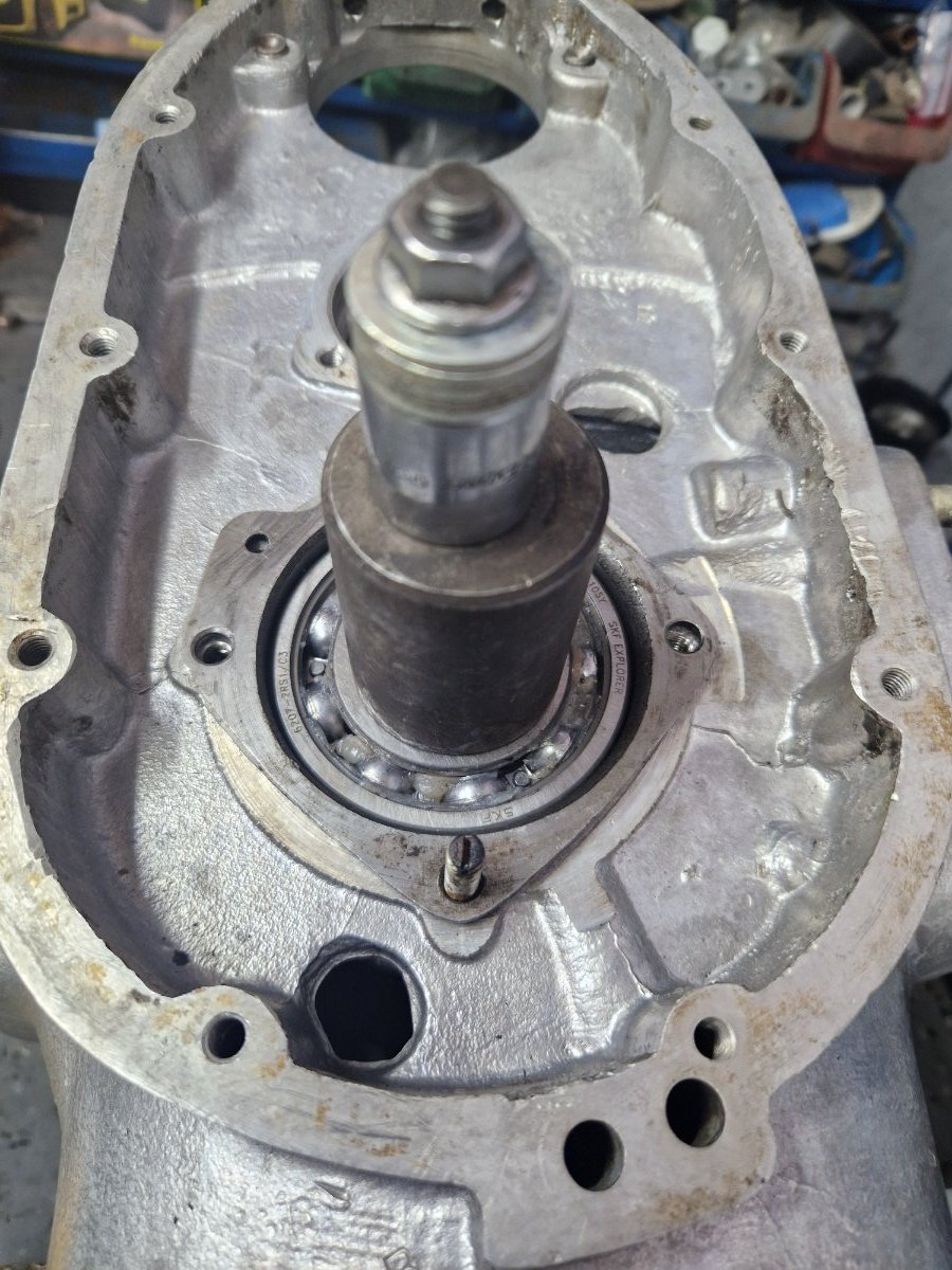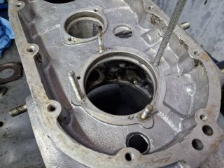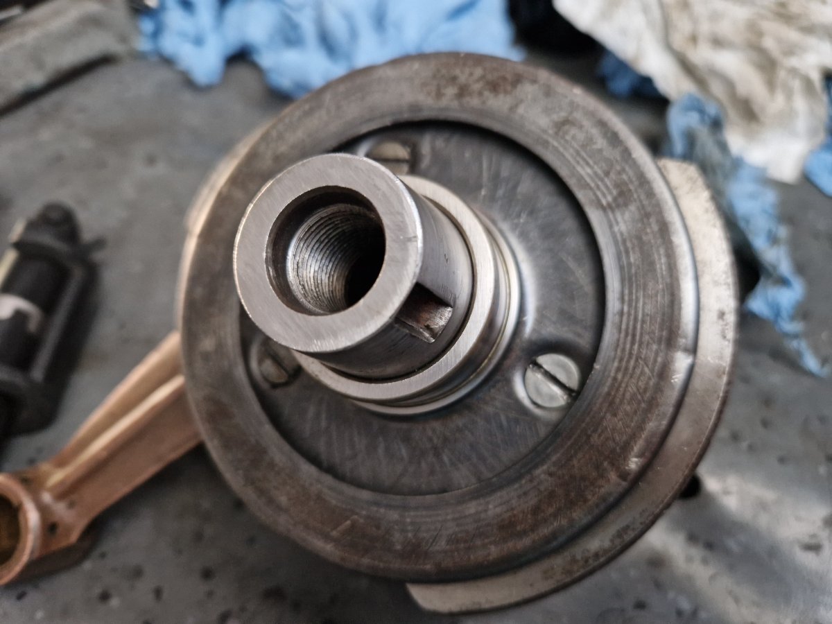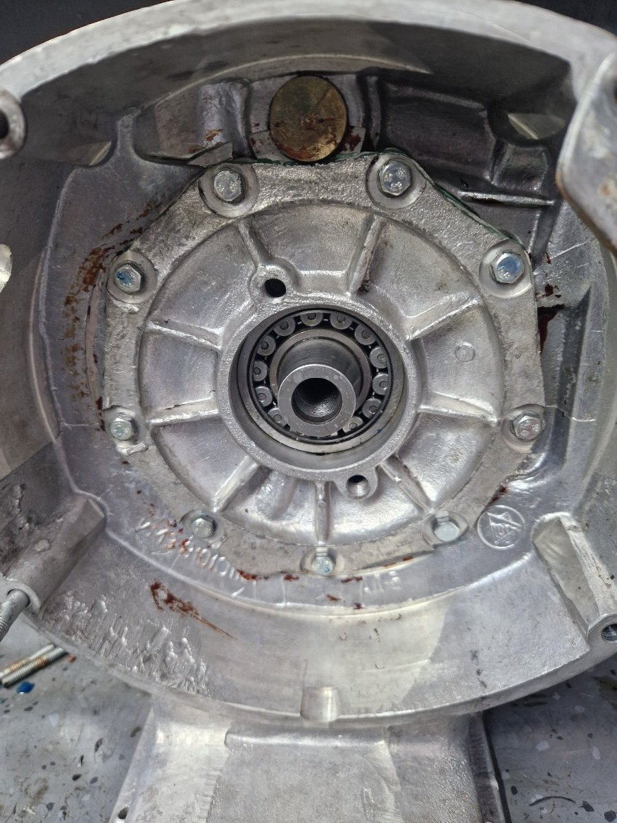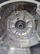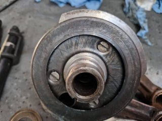 Am montat tavile de centrifugare a uleiului, la suruburi am folosit Loctite si astfel nu am mai dat chernere pentru blocare. Pentru cine nu stie aceste tavi de centrifugare a uleiului au doua functii: de filtrare a uleiului prin centrifugare si de lubrifiere a bielelor acestea comunicand cu boltul ambielajului pe care ruleaza rolele din biela. Este foarte important ca acestea sa fie curate la montare si in stare foarte buna fara rupturi, indoituri, etc ele fiind esentiale pentru buna functionare a ambielajului. Asamblarea palierului fata in carter, se incalzeste bine carterul si se introduce palierul in carter. Am pus si niste prezoane pentru a ghida palierul: Dupa aceea am "inventat" o presa si am tras ambielajul in rulmentul palierului: Pentru palierul spate am facut garnitura dintr-un carton de calitate, am si garnitura "originala di pi stoc" dar calitatea ei e slaba avand materialul permeabil. Pentru etansare am folosit Curil, tubul verde. Surubul negru cu gaura pentru sarma de siguranta este original, am folosit suruburi mai lungi cu trei filete etansate si securizate cu Loctite. Am pus suruburi mai lungi deoarece suruburile originale nu folosesc tot filetul din carter fiind mai scurte. Dupa montarea ambielajului am avut ocazia sa probez daca volantul atinge in suruburile palierului spate, din fericire nu atinge dar ca masura de precautie am renuntat la folosirea saibelor. Am mai reparat astfel de motoare si am avut surpriza ca la unele sa fiu nevoit sa renunt la saibe deoarece atingea volantul in suruburi. -