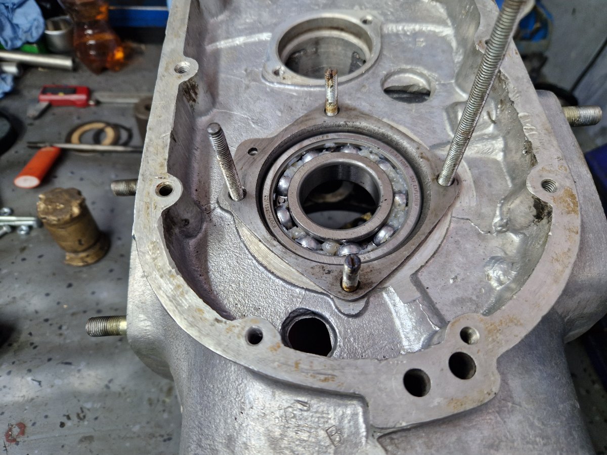 Mici progrese, pregatesc montarea ambielajului in carter dar aceasta pregatire este una minutioasa si ia mult mai mult timp fata de asamblarea propriu-zisa. Trebuie verificate atent toate piesele: ambielaj, tavitele de centrifugare a uleiului, palierii in care intra rulmentii ambielajului. Rulmentii sunt SKF 6207 C3 cu bile si URB NJ207 cu role. In mod normal sunt necesari doi rulmenti 6207 C3 dar rulmentul cu role NJ207 cu role va fi montat in spatele ambielajului unde vine volanta. Avantajul este ca rulmentul cu role este mai rezistent si totodata ajuta mult la montarea palierului spate deoarece camasa interioara se monteaza pe arbore si intra prin alunecare pe bile. Astfel te "chinui" sa presezi palierul spate doar in carter, nu si pe rulment. Sistemul cu rulment cu role in spate il are si Dnepr650 dar de fapt treaba este inspirata de la motoarele de BMW care s-au facut in anii '50. -