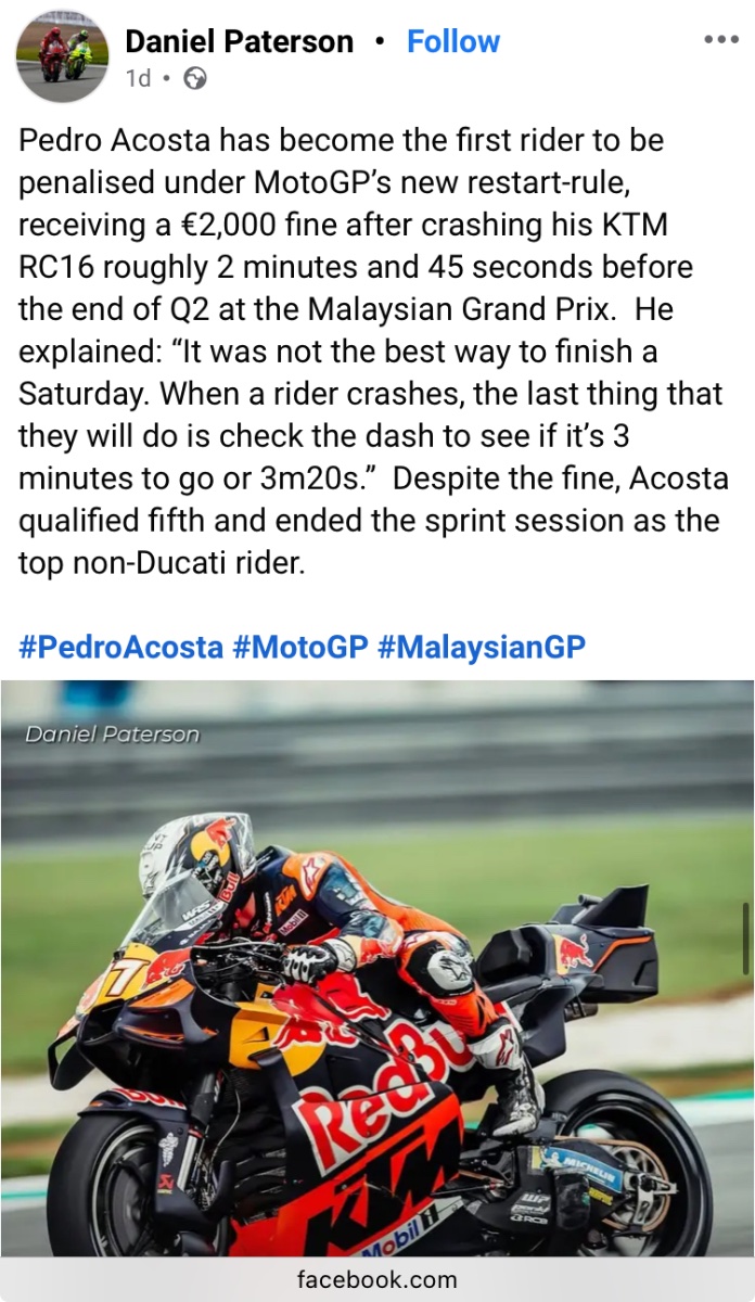 Method Postat 2 ore în urmă Share Postat 2 ore în urmă Acum 3 ore, damager a spus: Se pare ca si Ducati si Honda sunt intresate de Q. Nu imi este clar cine a fost de vina aici, Rueda care a venit din spate, nu avea viziblitate asta e clar, erau mai multi piloti pe interior, clar nu l-a vazut, sau baiatul ala care merge asa lent. In regulament nu exista ceva care as reglementeze viteza in lap-ul de formare. Probabil ca se va pune. Îți dai seama ca oricine e interesat de un om care e în stare sa ia.. câte pole uri a luat Q anul ăsta?cu cea mai slabă motoreta de pe grila. Plus semi-victoria (nush cum sa ii zic altfel) de la Silverstone. E la mintea cocoșului. Acuma sa nu cumva sa citeasca si ei review'urile colegului xt despre el și sa își dea seama ca "e overrated" Însă și eu zic după cum zice colegul frigider ca Q probabil va aștepta testul din februarie de la Sepang sa vadă versiunea 2026 a V4 pana sa ia o hotărâre drastică.Daar...după cum se întrevede...V4 Yamaha va fi tot o Yamaha,so? Eu bag o predicție - în 2027 îl vom vedea pe Q în negru lângă Bezzechi. Amândoi au fost de vină,unul a facut una a la Marquez moto2 celălalt dormea pe trasă...însă as zice ca vina e 70%Rueda 30% celălalt - Rueda are experiență și vorba ta - tânăr înțeleg dar la nivelul lui Rueda faci point fixation nu ieși de pe circuit?Din astea se întâmplă la amatori sau la moto3 în cursă nu când se merge la lejer în turul de formare. Nu înțeleg de ce si-a luat Acosta penalizare pt ca a intrat după ce a căzut în ultimele 3 min - regula asta era veche?ca nu am văzut sa fie aplicata pana acum... Și plus de asta - vorba comentatorilor - de unde știe Acosta care e setat sa faca turul dacă mai sunt 3.10 min sau 2.50 pe cronometru? În teorie e buna regula dar greu aplicabilă în practică. Ar trebui sa le arate un steag ceva sau un led idk pe bord care sa insemne - "din momentul asta dacă cazi no rejoin",pt ca ei cu adrenalina în roșu și cu 170 puls nu stau sa numere minutele sau sa se uite la cronometru pe ecrane sa vadă când e 2.59. Citează Link spre comentariu Distribuie pe alte site-uri More sharing options...
